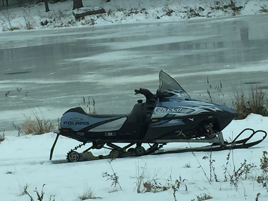 The kids cleared off part of the pond, and voila! Instant ice hockey rink! And up here, getting a snowmobile like this one isn't so surprising.