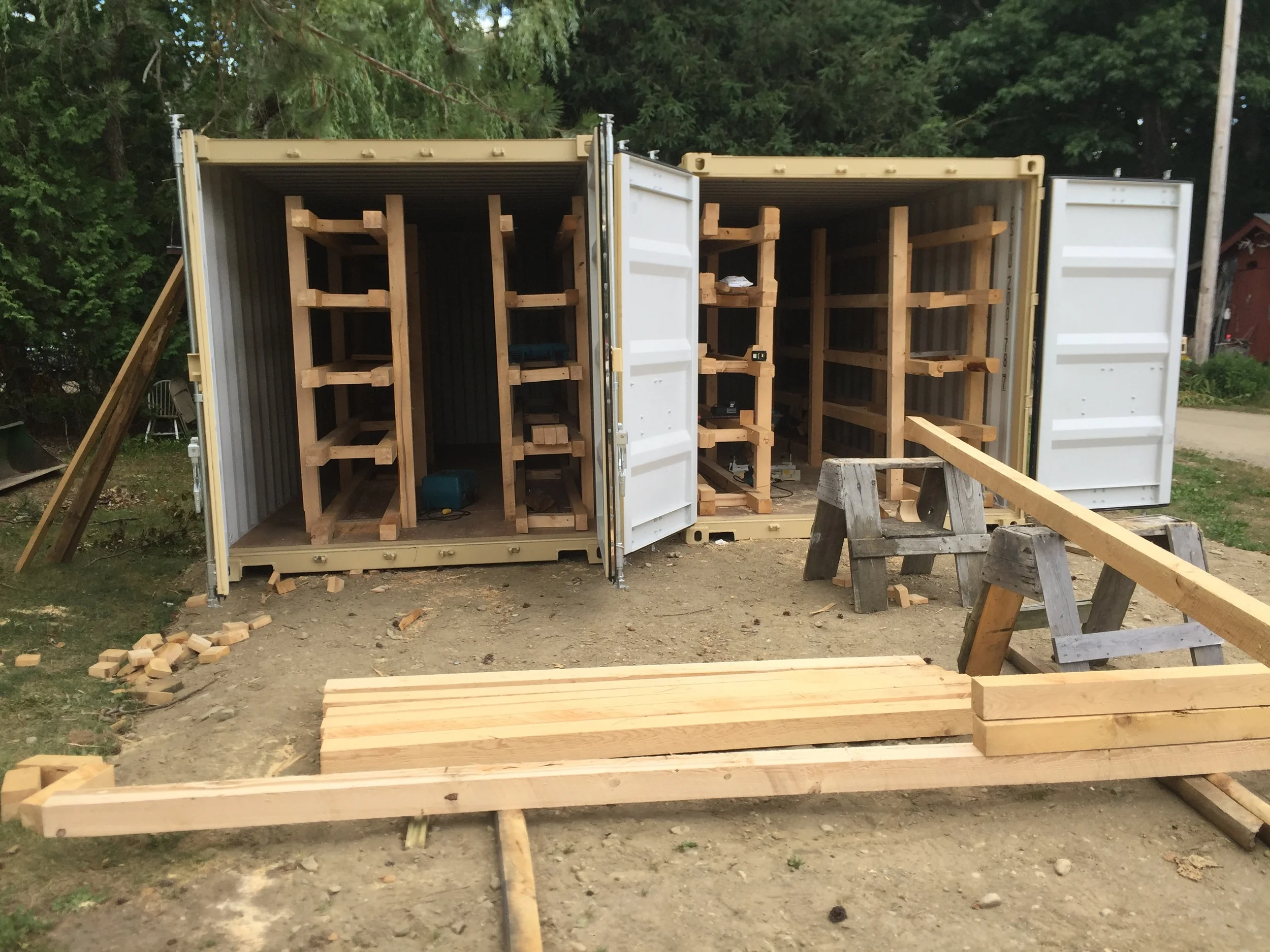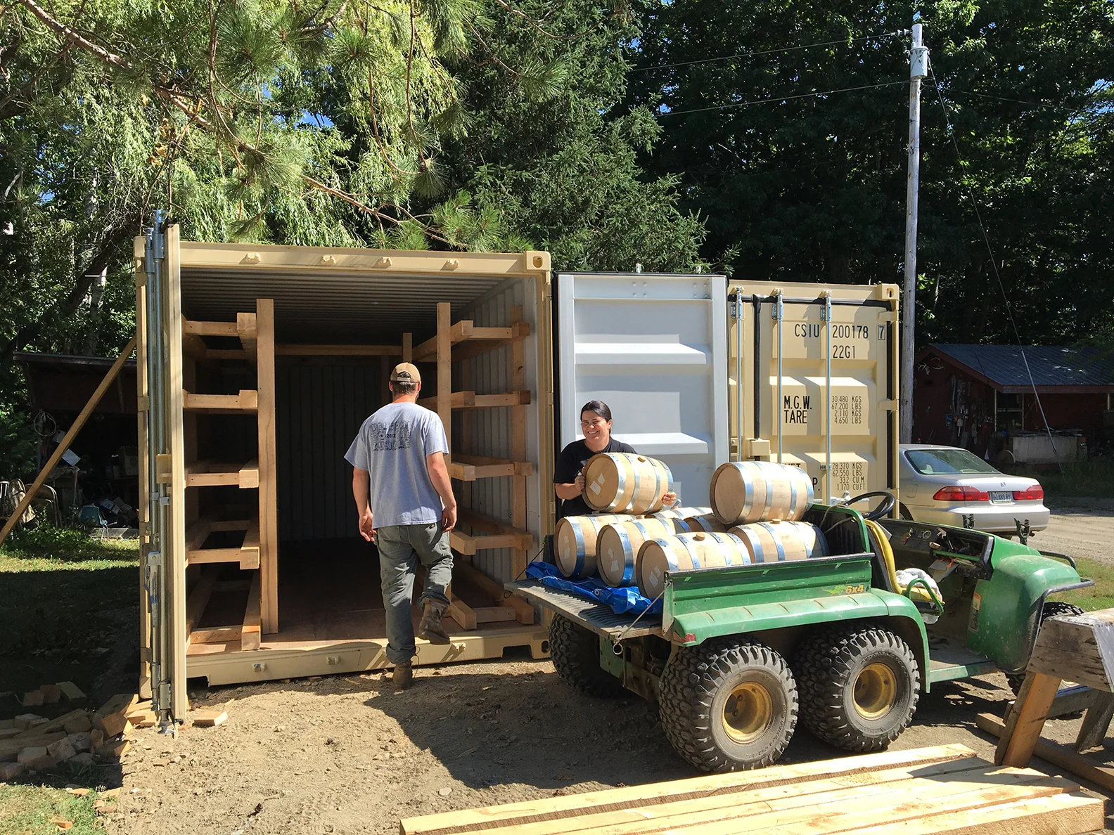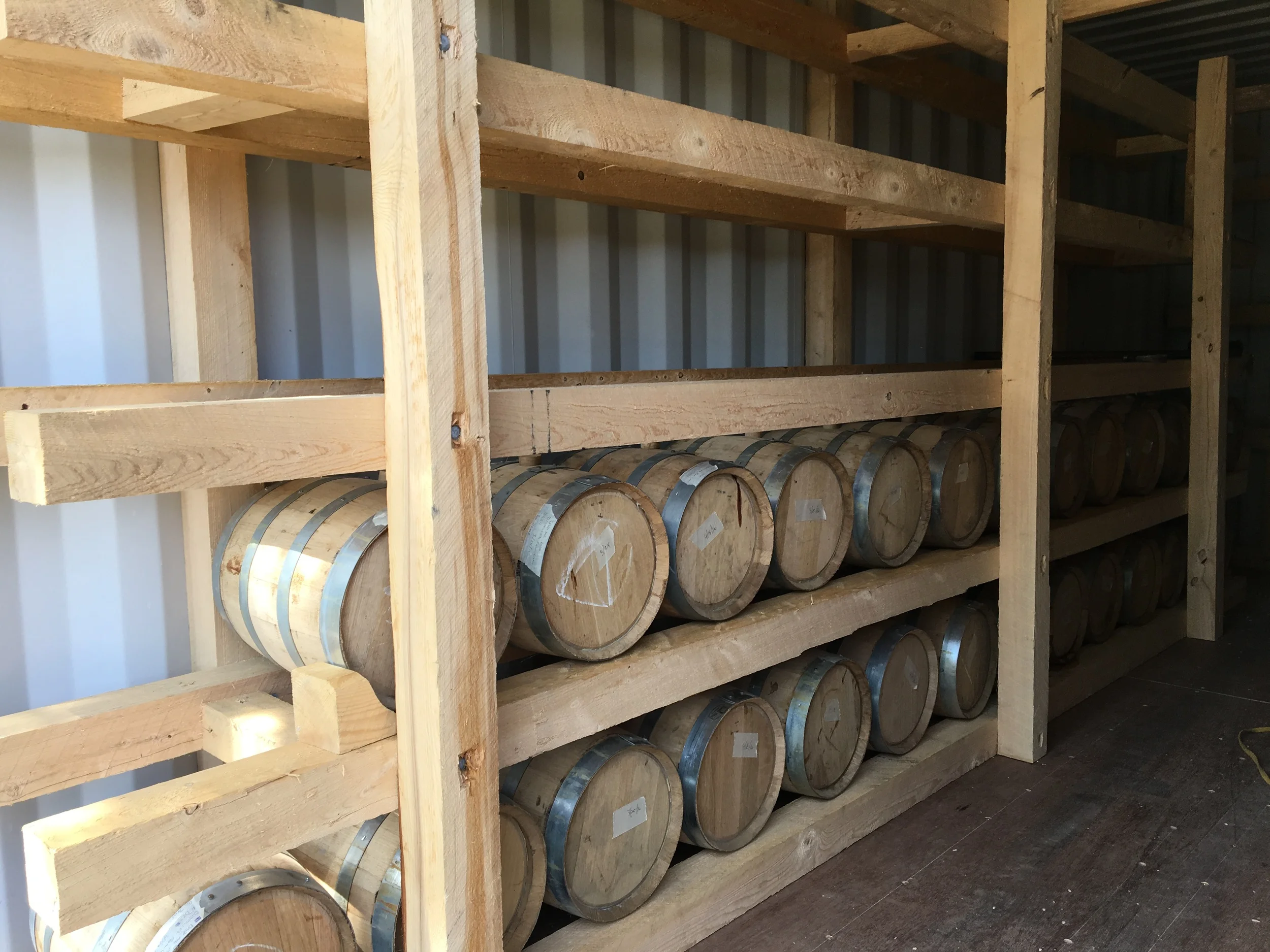 These rented units are repurposed shipping containers. Perfect for our purposes. Each unit can hold up to 150 barrels. And best yet, the wooden racks can be taken out and put into the permanent facility when it's ready.