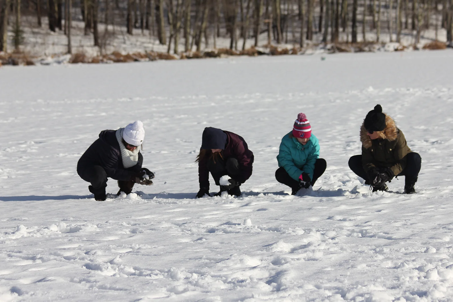 Actually, first things first: making snowballs in the middle of a frozen pond.